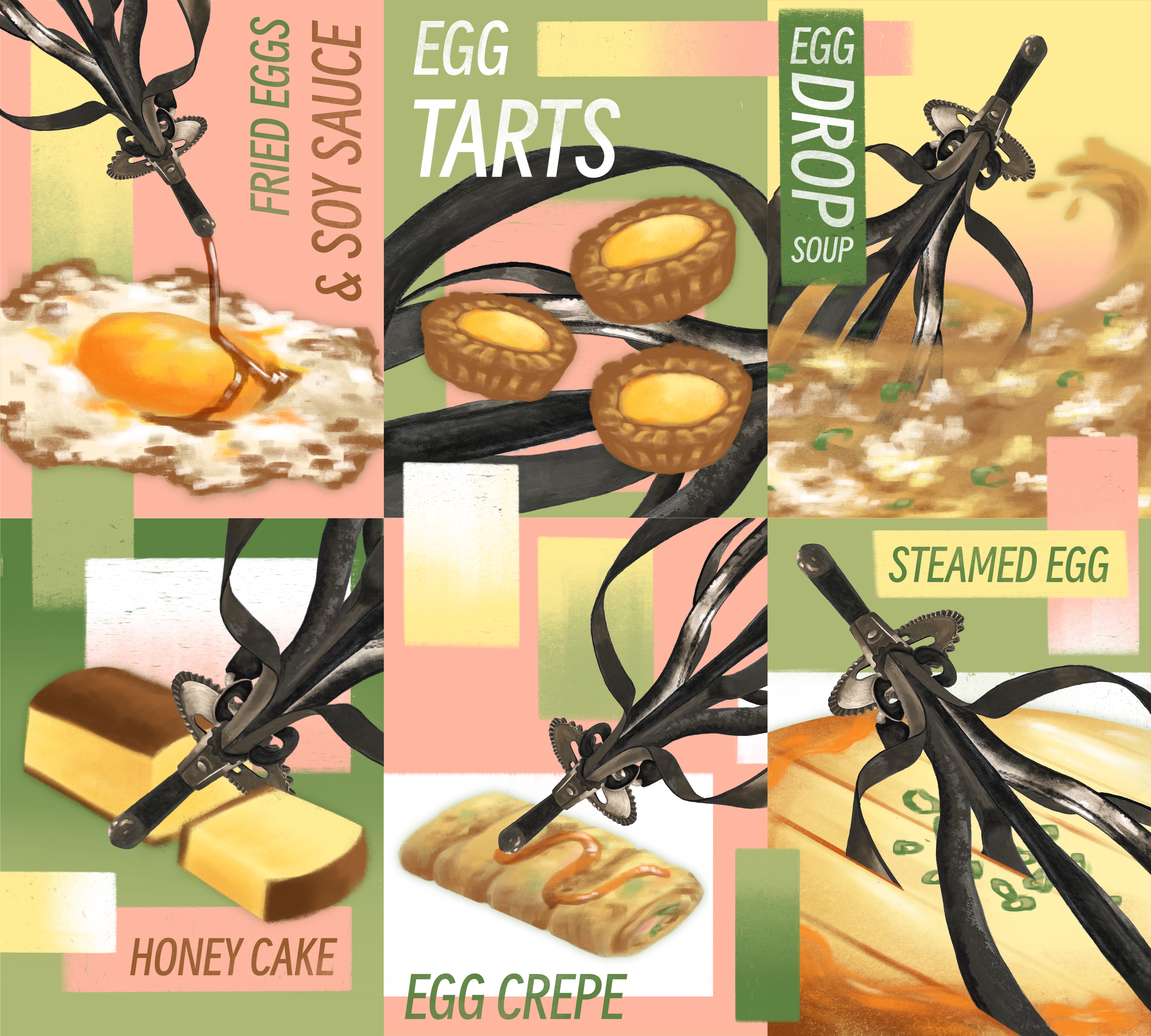 Highlights a food that I grew up with: eggs. Established continuity across compositions with a warmer color scheme (for nostalgia) that includes yellow, the egg beater (representing the endless potential inoffensive eggs), and blocks that go across poster borders. Overlapping but blocky elements establish composition that shows "organized chaos" of a kitchen